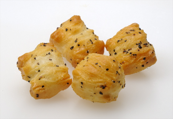 歯ごたえのあるまるっころ餅を塩味で仕上げ、ブラックペッパー(黒コショウ)をまぶしました。ピリッと辛いオトナのおかきです。油では揚げていません。